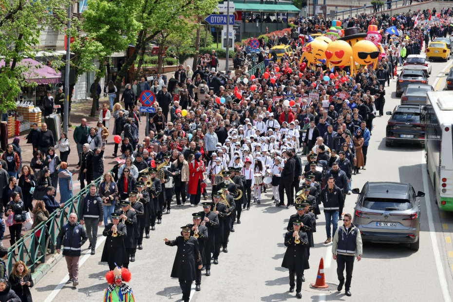 23 Nisan coşkusu, yüzlerce çocuk ve ailelerinin katılımıyla Çarşıbaşı’ndan Atatürk Stadyumu Kütüphanesi’ne doğru yapılan kortej yürüyüşüyle başladı. Ellerinde Türk bayraklarıyla marşlar ve şarkılar söyleyen çocuklara, Büyükşehir Belediyesi Başkan Vekili Şahin Biba, AK Parti Bursa İl Başkanı Davut Gürkan, AK Parti Bursa Milletvekili Mustafa Yavuz, Büyükşehir Belediyesi Genel Sekreteri Deniz Köken, meclis üyeleri, siyasi parti temsilcileri, sivil toplum kuruluşları üyeleri ve aileler de eşlik etti. Çocuklar, ellerindeki pankartlar, Türk ve Atatürk bayraklarıyla Atatürk Stadyumu Kütüphanesi’ne kadar bando eşliğinde coşkuyla yürüdü.