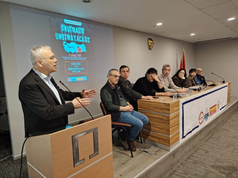 6 Şubat 2023’te Kahramanmaraş merkezli yaşadığımız depremlerin 3. yılında DİSK, KESK, TMMOB ve TTB ortak basın açıklaması düzenledi. Açıklamayı TMMOB Bursa İl Koordinasyon Kurulu Sekreteri Murat Korkut okudu.