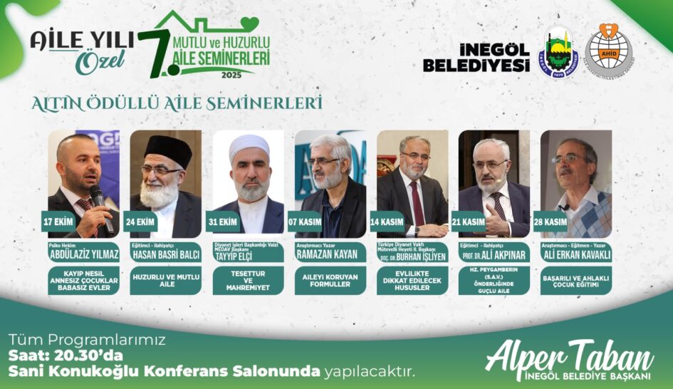 İnegöl Belediyesi’nin Aile Hayatı İyileştirme Derneği iş birliğinde düzenlediği “Aile Okulu” eğitimlerinim 7’nci dönemi başlıyor. Eğitimler 17 Ekim itibariyle 7 hafta boyunca her Cuma 20.30’da Sani Konukoğlu Konferans Salonunda yapılacak. Her hafta farklı konu ve konuklarla mutlu ve huzurlu ailenin şifreleri paylaşılacak.