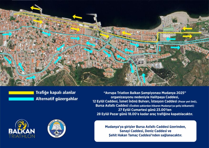 “2025 Avrupa Triatlon Balkan Şampiyonası, Mudanya Belediyesi ve Türkiye Triatlon Federasyonu iş birliğiyle 28 Eylül Pazar günü Mudanya’da gerçekleştirilecek. Türkiye ve yabancı ülkelerden profesyonel ve amatör triatlerin yarışına sahne olacak şampiyona; yaş grupları, elit ve gençler kategorilerinde gerçekleşecek. Sporcular kürsü görmek için yüzme, bisiklet ve koşu etaplarıyla Mudanya’nın doğal güzellikleri eşliğinde mücadele edecek.