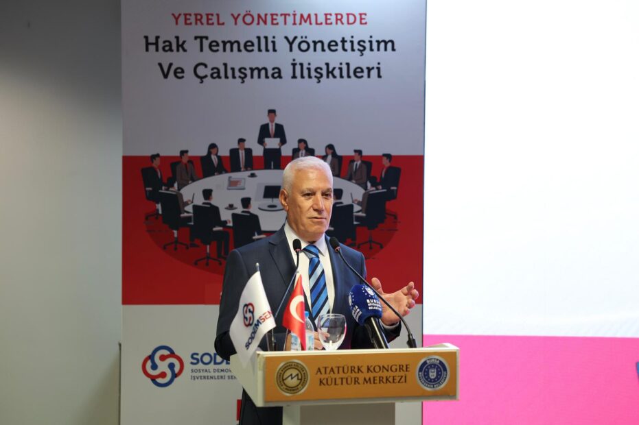 SODEMSEN tarafından düzenlenen ‘Yerel yönetimlerde hak temelli yönetişim ve çalışma ilişkileri’ başlıklı eğitim ve çalıştay, Atatürk Kültür Merkezi Merinos Yerleşkesi’nde yoğun katılımla gerçekleştirildi. Çalışan haklarının korunması ve yerel yönetimlerde sosyal adaletin güçlendirilmesi gibi başlıkların ele alındığı programda konuşan Büyükşehir Belediye Başkanı Mustafa Bozbey, yerel yönetimlerde hak temelli hizmet anlayışının toplumun her kesimine eşit ve adil hizmet götürmek açısından büyük önem taşıdığını belirtti.