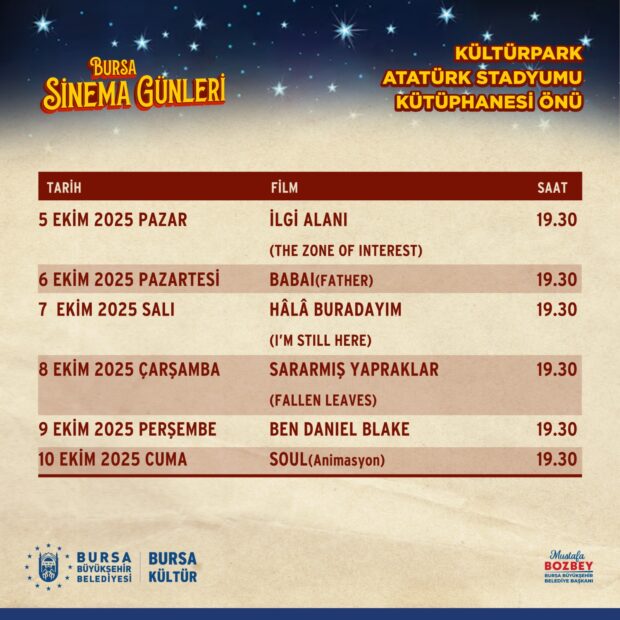 Irgandı Köprüsü, Atatürk Stadyumu Kütüphanesi önü, Merinos Parkı, Tayyare Kültür Merkezi ve ilçelerde gerçekleştirilecek gösterimler, Bursalılara yıldızların altında sinema keyfi yaşatacak. Bursa’nın tarihi ve kültürel mekânlarının büyülü atmosferinde yapılacak olan film gösterimleri, vatandaşlara hem yazdan kalma akşamların keyfini çıkarma hem de seçkin filmlerle buluşma fırsatı sunacak. Bursa Sinema Günleri kapsamında hazırlanan yönetmen söyleşileriyle de sinemanın mutfağına ışık tutulacak. Katılımcılar, yönetmenlerle bir araya gelerek film yapım süreci hakkında doğrudan bilgi alma ve soru sorma imkânı da bulacak.