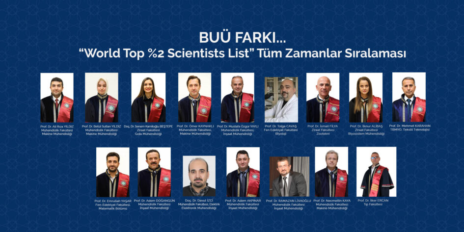 Bu yıl için yayımlanan listede BUÜ’den 21 bilim insanı en iyiler arasında gösterildi. Prof. Dr. Ali Rıza Yıldız, Prof. Dr. Davut İzci, Prof. Dr. Mustafa Özgür Yaylı, Doç. Dr. Senem Kamiloğlu Beştepe, Prof. Dr. Betül Sultan Yıldız, Prof. Dr. Ömer Kaynaklı, Prof. Dr. Mehmet Karahan, Prof. Dr. Emrullah Yaşar, Prof. Dr. Adem Doğangün, Doç. Dr. Murtaza Cicioğlu, Prof. Dr. Ali Mardani, Prof. Dr. Muhsin Kılıç, Prof. Dr. Hıdır Selçuk Noğay, Doç. Dr. Emre İsa Albak, Doç. Dr. Arzu Akbulut, Prof. Dr. Ramazan Livaoğlu, Prof. Dr. Tülay Özcan, Prof. Dr. Tolga Çavaş, Prof. Dr. İsmail Filya, Prof. Dr. İlker Ercan ve Prof. Dr. Necmettin Kaya listede yer almayı başardı.