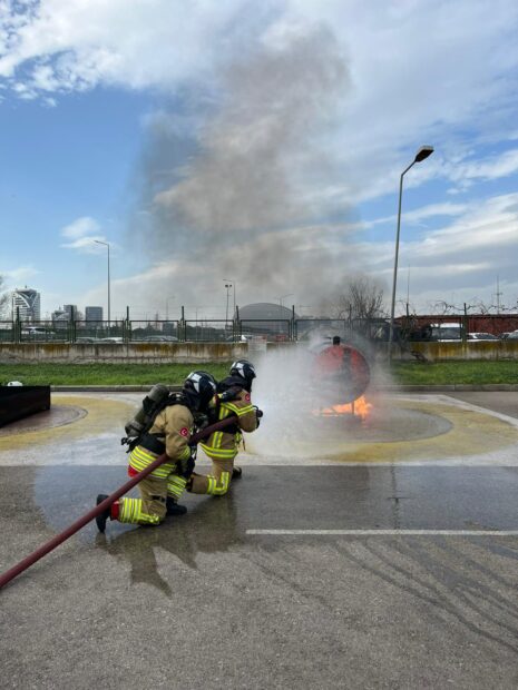 Hortum kullanımı ve söndürme prensipleri, iniş çıkış sistemleri, sedye ile tahliye uygulamaları, kaza yeri güvenliğinin sağlanması, hidrolik kurtarma ekipmanlarının etkin kullanımı ve yaralı tahliyesi gibi konular teorik ve uygulamalı olarak anlatıldı. Sahada karşılaşılabilecek gerçek durumların senaryolaştırıldığı eğitimlerde, itfaiyeciler özveriyle mücadele ederek yangını söndürdü.
