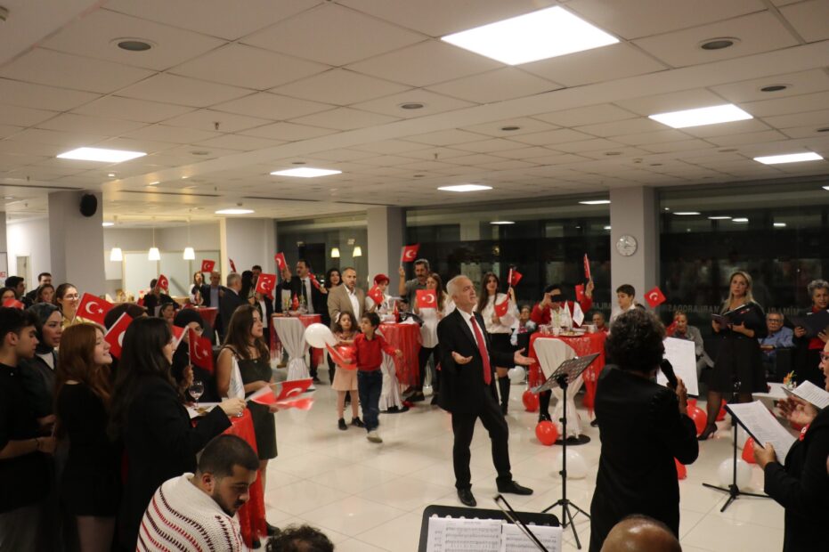 Açılış konuşmanın ardından başlayan etkinlikte, oda üyelerinden oluşan Türk Sanat Müziği korosu sahne aldı. Atatürk’ün sevdiği şarkıların seslendirildiği bölümde davetliler ellerinde Türk bayraklarıyla koroya eşlik etti.
