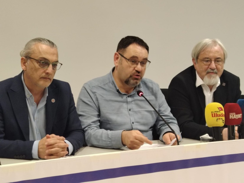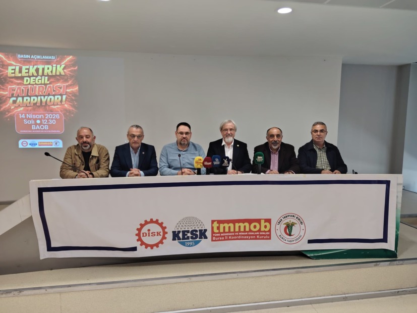 DİSK, KESK, TMMOB ve TTB Bursa bileşenleri, Enerji Piyasası Düzenleme Kurumu’nun yürürlüğe giren kararıyla konut elektrik tarifelerine yapılan yüzde 25’lik zam sonrası ‘Elektrik değil, faturası çarpıyor’ başlığıyla 14 Nisan 2026’da basın açıklaması gerçekleştirdi. BAOB Ortak Salondaki açıklamayı TMMOB Elektrik Mühendisleri Odası Bursa Şube Başkanı Burak Özgen okudu.