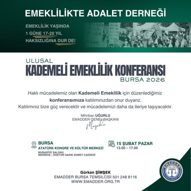 Emeklilikte Adalet Derneği (EMADDER) 15 Şubat’ta Kademeli Emeklilik Konferansı düzenliyor. Merinos Atatürk kültür Merkezinde yapılacak olan konferansa EMADDER Genel Başkanı Mihriban Uğurlu’da katılacak. EMADDER Bursa Şube Başkanı Gürkan Şimşek, yazılı basın açıklaması yaparak tüm Bursalıları konferansa davet etti.