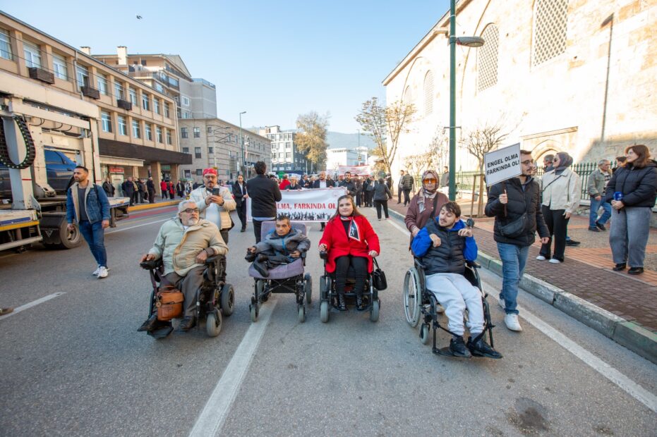 Dünya Engelliler Günü kapsamında ‘Engelli Farkındalık Yürüyüşü’ düzenlendi. Ulu Cami önünde bir araya gelen özel gereksinimli bireylere Bursa Büyükşehir Belediye Başkanı Mustafa Bozbey’i temsilen Büyükşehir Belediyesi Genel Sekreter Yardımcısı Mehmet Yıldız, Bursa Vali Yardımcısı Mustafa Güney, Bursa Kent Konseyi Başkanı Prof. Dr. Ertuğrul Aksoy, sivil toplum kuruluşlarının temsilcileri ve vatandaşlar eşlik etti. ‘Farklılıklarımızla Daha Güçlüyüz’ yazılı pankart taşıyan vatandaşlar, ellerindeki dövizlerle ‘Engel olma, farkında ol’ mesajı verdi. Büyükşehir Belediye Bandosu’nun da eşlik ettiği yürüyüş, Atatürk Anıtı’nda sona erdi. Saygı duruşu ve İstiklal Marşı’nın ardından  çelenk sunumu gerçekleştirildi.