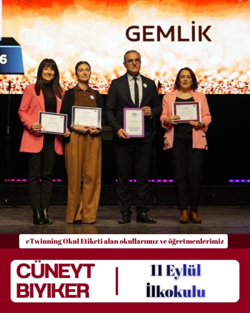 2025 yılı eTwinning çalışmalarından dolayı Gemlik’ten 11 Eylül İlkokulu, Cumhuriyet İlkokulu, Gemlik Anadolu İmam Hatip Lisesi, Gemport Gemlik Anadolu Lisesi, Roda Anadolu İmam Hatip Lisesi ve Şehit Öğretmen Etem Yaşar İlkokuluna Okul Etiketi kalite ödülü verildi.