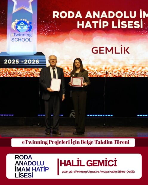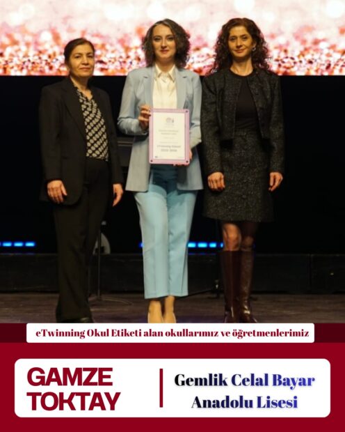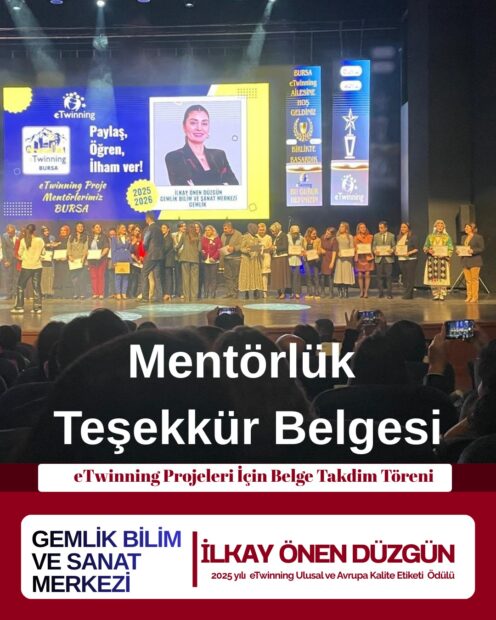 Bursa İl Millî Eğitim Müdürlüğü tarafından düzenlenen “eTwinning Okul Etiketi ve Kalite Etiketi Belge Takdim Töreninde Gemlik’ten katılan15 öğretmene 2025 yılı eTwinning Ulusal ve Avrupa Kalite Etiketi ve 14 okul idarecisi ve öğretmene Okul Etiketi kalite ödülü verildi.