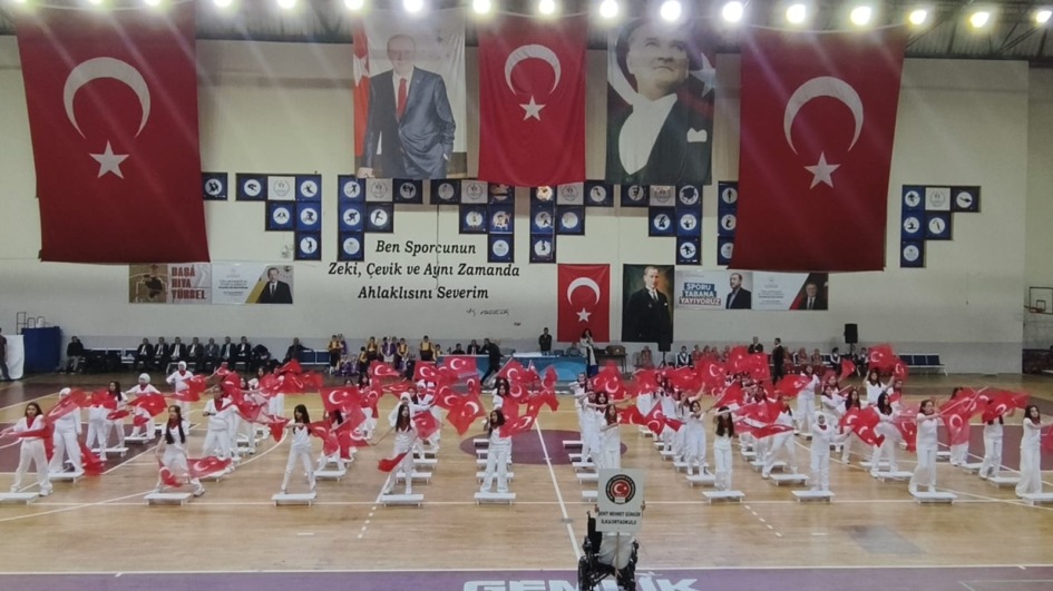 Resmi kutlama programı ise saat 11.00’de Atatürk Spor Salonu’nda gerçekleştirildi. Program, saygı duruşu ve İstiklâl Marşı’nın okunmasıyla başladı.