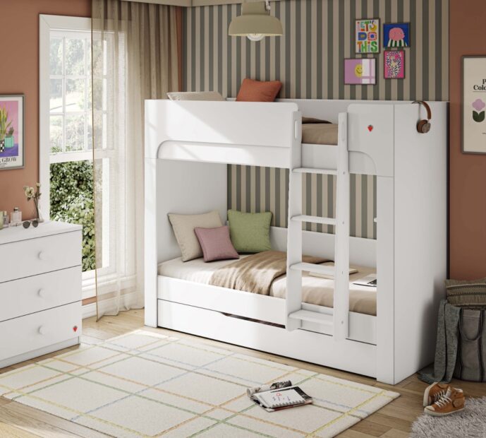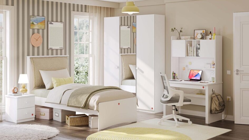 Varia Beyaz, minimalist tasarımıyla her yaşa hitap eden, hafif ama etkili bir dekorasyon dili sunarak çocuk ve genç odalarına modern bir ferahlık getiriyor.