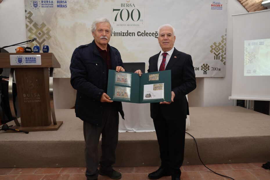 Programın ardından Büyükşehir Belediye Başkanı Mustafa Bozbey tarafından Yenişehir Belediye Başkanı Ercan Özel ve Bursa Uludağ Üniversitesi Fen Edebiyat Fakültesi Tarih Bölümü öğretim üyesi Dr. Sezai Sevim’e günün anısına PTT’ye bastırılan 700. yıl portföyünü hediye etti. Yenişehir Belediye Başkanı Ercan Özel de Başkan Mustafa Bozbey ve Dr. Sezai Sevim’e Yenişehirli kadınların ipek kozasından yaptığı Türk Bayrağı’nı hediye etti.