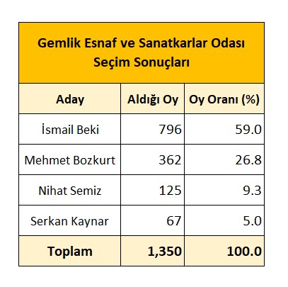 Gemlik Esnaf ve Sanatkarlar Odasının Olağan Kongresinde ipi bir kez daha mevcut başkan İsmail Beki ve yönetimi göğüsledi. Geçerli oyların yüzde 59’unu alan İsmail Beki, üst üste dördüncü kez Gemlik Esnaf ve Sanatkarlar Odasının Başkanı oldu. Dört adaylı kongrede, İsmail Beki ve yönetimi 796 oy alırken, Mehmet Bozkurt 362 oyda kaldı. Diğer adaylardan Nihat Semiz’e 125, Serkan Kaynar’a da 67 oy çıktı.
