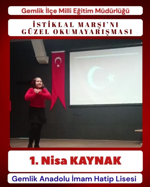 Gemlik İlçe Milli Eğitim Müdürlüğünün İstiklâl Marşı’nın Kabulü ve Mehmet Akif Ersoy’u Anma Günü etkinliklerini kapsamı içinde İstiklâl Marşı’nı Güzel Okuma Yarışması yapıldı.