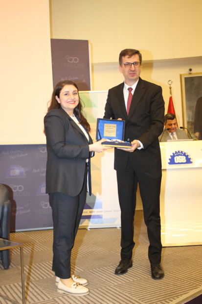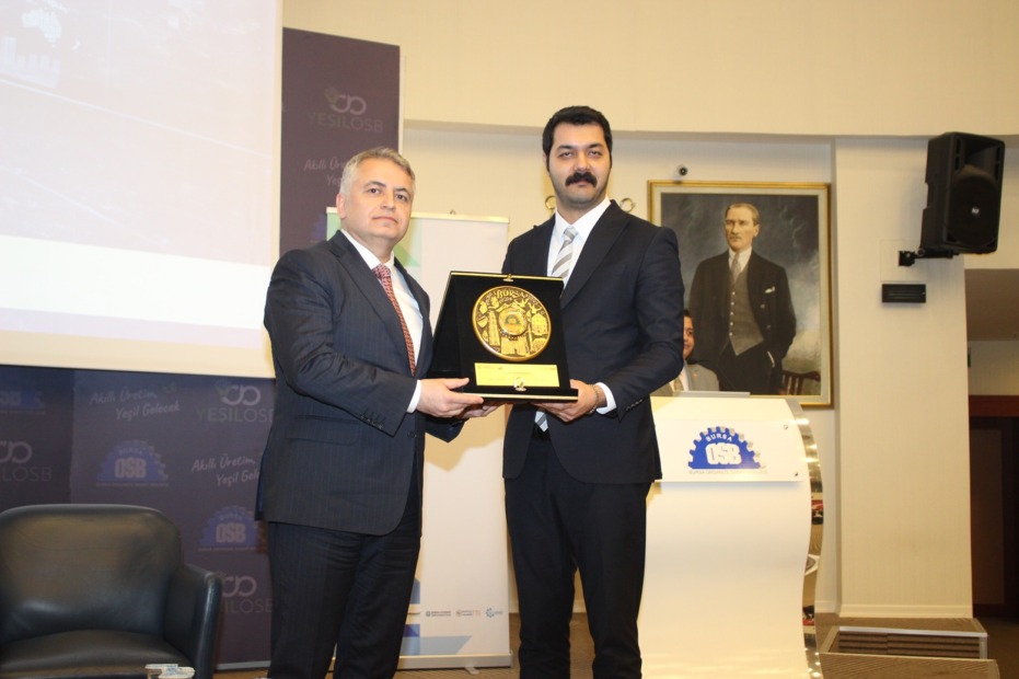 Bursa Organize Sanayi Bölgesi Müdürü Osman Yıldırım, T.C. Ticaret Bakanlığı İhracat Genel Müdürü Mehmet Ali Kılıçkaya’ya, konuşmasının bitiminde, Bursa’nın tarihi ve turistik değerlerinin işleme sanatıyla resmedildiği plaket takdim etti.