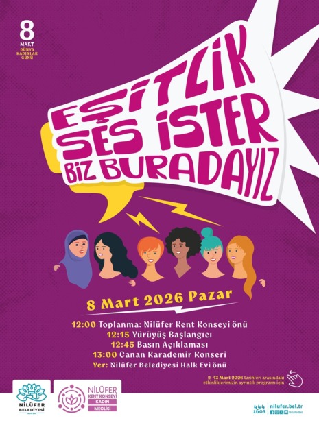 Nilüfer Belediyesi, Nilüfer Kent Konseyi iş birliğiyle 8 Mart Dünya Kadınlar Günü kapsamında kadınların toplumsal hayattaki yerine ve hak taleplerine dikkat çekmek amacıyla kapsamlı bir etkinlik programı düzenliyor. “Eşitlik Ses İster Biz Buradayız” sloganıyla hazırlanan etkinlikler, 2 – 8 Mart tarihleri arasında kentin dört bir yanında Nilüferlilerle buluşacak.
