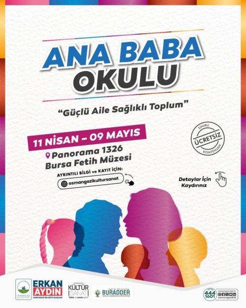 Osmangazi Belediyesi Kültür, Sanat ve Sosyal İşler Müdürlüğü’nün Bursa Aile Danışmanları ve Eğitimi Derneği iş birliğiyle 11 Nisan ile 9 Mayıs tarihleri arasında düzenleyeceği program, her Cumartesi saat 12.00’de gerçekleştirilecek. İlk dört oturum Panorama 1326 Bursa Fetih Müzesi’nde, final oturumu ise Ördekli Kültür Merkezi’nde yapılacak. Alanında uzman isimlerin katılacağı eğitimlerde; aile olmanın temel dinamiklerinden ebeveynlikte doğru sınırlar koymaya, çocukların değişen dünyadaki konumundan aile içi krizlerin fark edilmesine kadar pek çok önemli konu kapsamlı bir şekilde ele alınacak.