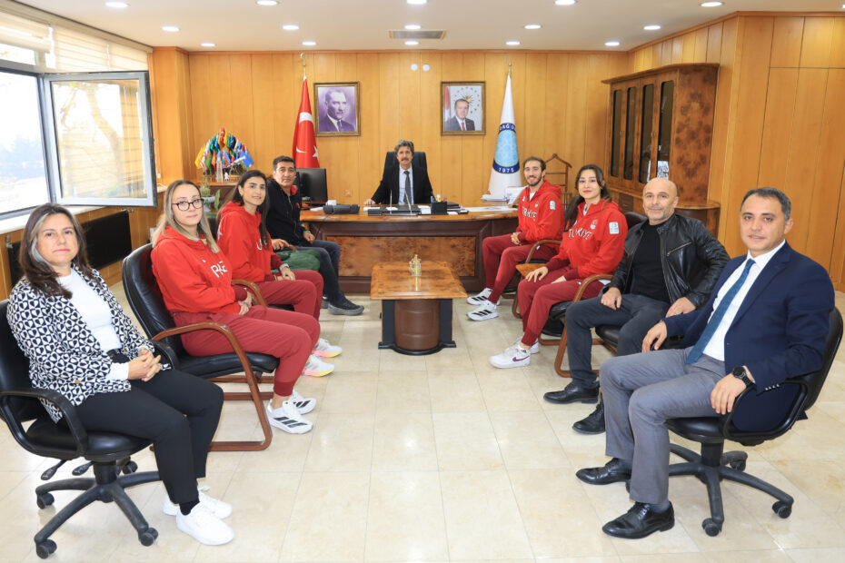 Spor Bilimleri Fakültesi Dekan Yardımcısı Prof. Dr. Şenay Şahin, Spor Koordinatörü Öğr. Gör. Tuncer Topsaç, SKS Daire Başkanı Erkan Süveydas ve öğrenci antrenörlerinin de yer aldığı ziyaretten dolayı büyük bir memnuniyet duyduğunu aktaran Rektör Yılmaz; “Göğsümüzü kabartmaya devam ediyorsunuz. Gerek öğrencilerimiz gerekse de akademik ve yönetici kadrolarımız üniversitemizin başarısı için elinden gelen gayreti gösteriyor. Bu bizleri ayrıca gururlandırıyor. Hepinizi gönülden bir kez daha tebrik ediyor, başarılarınızın devamını diliyorum” dedi.