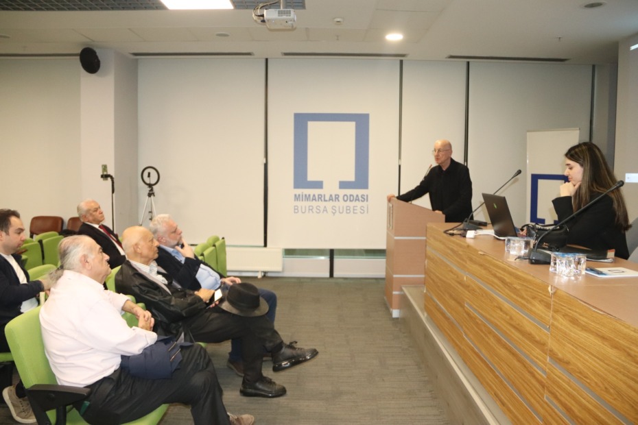 Konuşmalarından ardından Mimar M. Fatih Aydın, MSGSÜ Mimarlık Bölümü Öğretim Üyesi Prof. Dr. Oğuz Ceylân’a, Mimarlar Odası Bursa Şubesi Yönetim Kurulu Üyesi Kurtuluş Göktaş da Yüksek Mimar Deniz Ezgi Ünlü’ye etkinliğe katılımlarından dolayı teşekkür belgesi takdim etti.