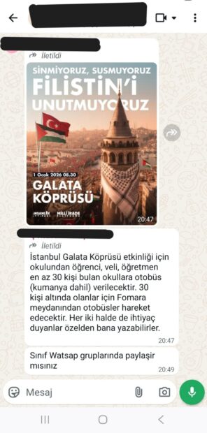 Öğretmenlere çağrımızdır: Ne böyle bir zorunluluğunuz ne de böyle bir göreviniz vardır. Biz öğretmenlerin görevi; öğrencileri bu gerici yapılardan ve istismar düzeninden korumaktır. Yasal olmadığını kendilerinin de bildiği ve bu nedenle WhatsApp üzerinden gönderdikleri mesajlara itibar etmeyiniz.